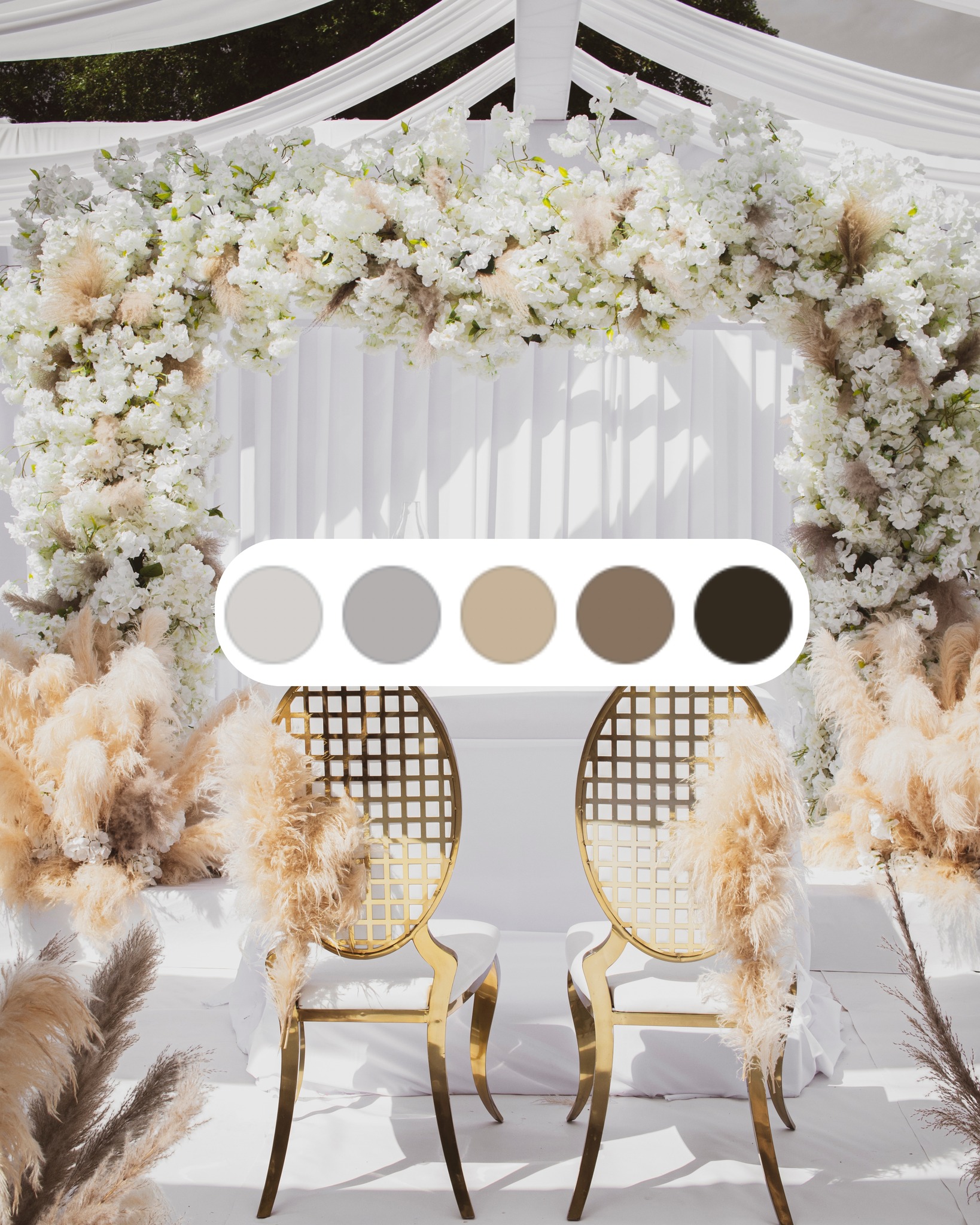 เทรนด์งานแต่งปลายปีนี้มาในโทนอบอุ่น เช่น Mocha Mousse, Beige, Cream, Sage Green และ Rose Gold ให้ฟีลธรรมชาติ เรียบหรู และดูแพง เหมาะกับงานแต่งริมทะเล งานแต่งในสวน หรือในบ้านบรรยากาศอบอุ่น
