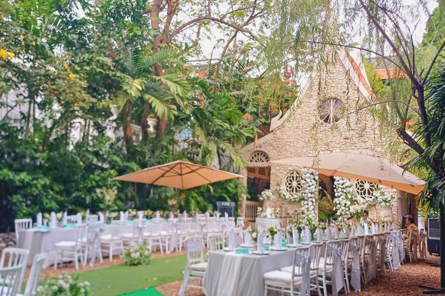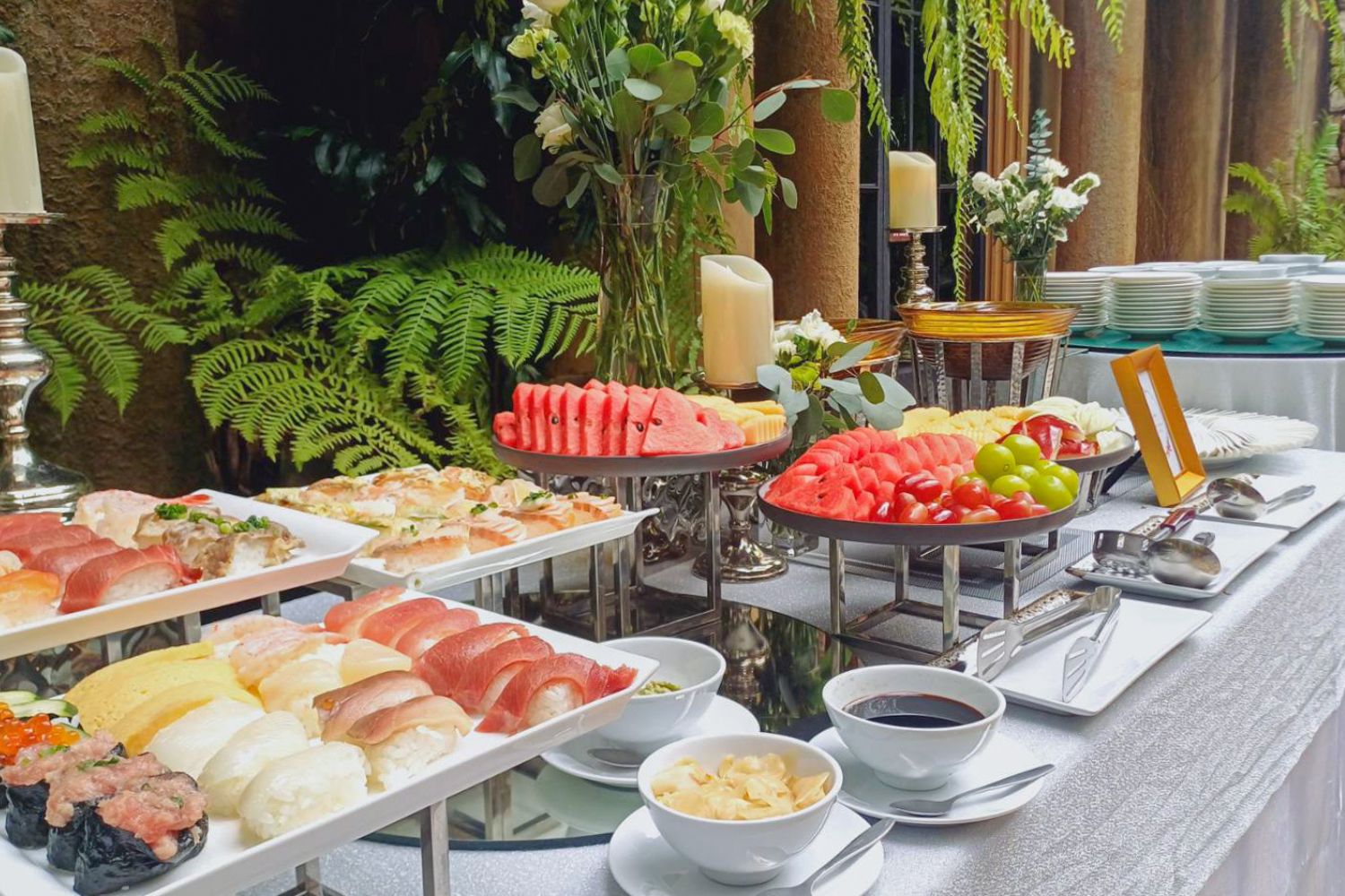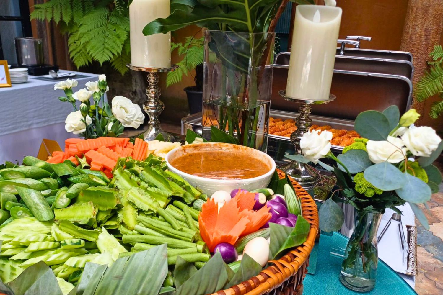 Set and Serve Catering ขอร่วมแสดงความยินดีและเป็นส่วนหนึ่งในวันสำคัญของคู่บ่าวสาว กับงานฉลองมงคลสมรสสุดคลาสสิก ณ อะกาลิโก สุขุมวิท 51 โดยเราได้จัดเตรียมพื้นที่ไลน์บุฟเฟต์อย่างลงตัว พร้อมเนรมิตบรรยากาศงานแต่งให้ดูอบอุ่นและโรแมนติกด้วยการตกแต่งดอกไม้ในธีม สีขาว (70%) และสีเขียว (30%) การจัดโต๊ะรับประทานอาหารประกอบด้วยโต๊ะยาว 7 โต๊ะ และโต๊ะกลมเสริมอีก 2 โต๊ะ ซึ่งปูด้วยผ้าคลุมโต๊ะธีมสีขาว-เทา ดูเรียบหรูและเข้ากับสไตล์ของสถานที่ได้อย่างสมบูรณ์แบบ