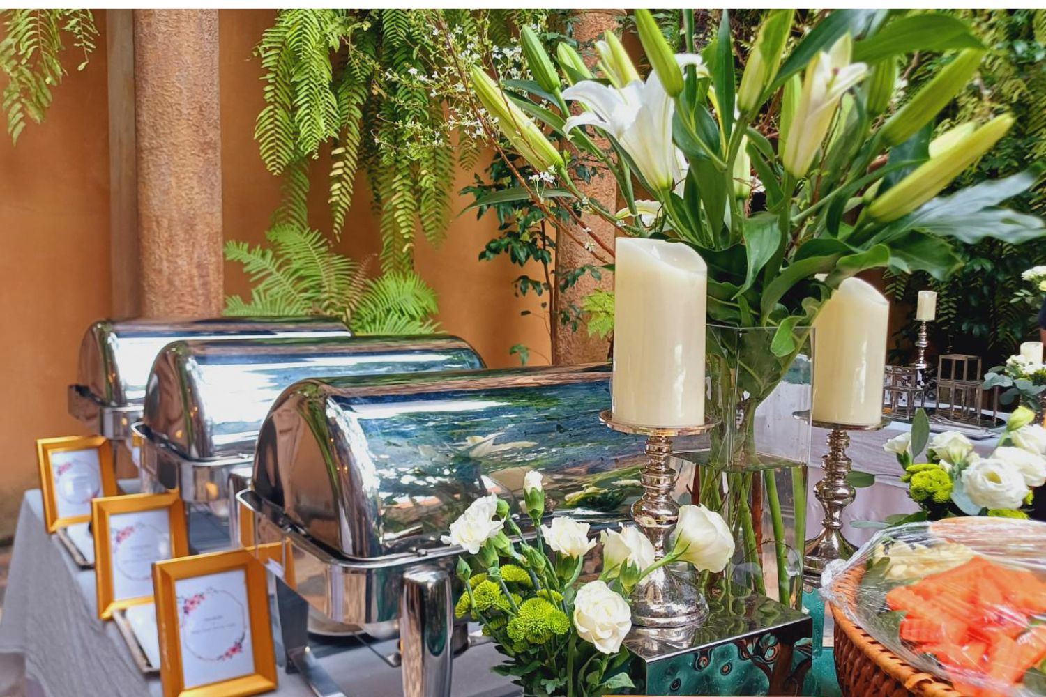 - เมนูของหวานสุดพิเศษ:ล้างปากด้วยผลไม้สดตามฤดูกาล, ลอดช่องน้ำกะทิหอมหวาน และไฮไลท์สำคัญสำหรับงานมงคลสมรสคือ เค้กนมสด 3 ชั้น ขนาด 6 ปอนด์ ที่ตกแต่งอย่างสวยงามตามรูปแบบของคู่บ่าวสาว