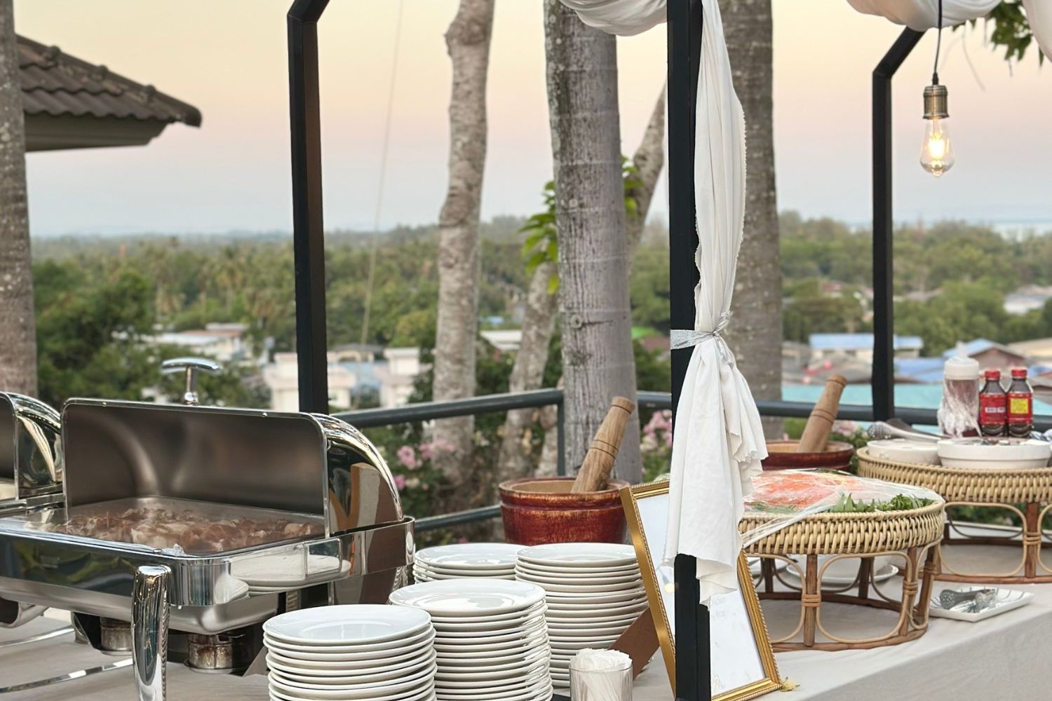 Set and Serve Catering ขอร่วมแสดงความยินดีและเป็นส่วนหนึ่งในวันสำคัญของคุณโทมัสและคุณฝน กับงานฉลองมงคลสมรสริมทะเลสุดเอ็กซ์คลูซีฟ ณ ไพรเวทวิลล่าส่วนตัว บริเวณหาดแม่พิมพ์ จังหวัดระยอง บรรยากาศงานแต่งถูกจัดขึ้นริมสระว่ายน้ำพร้อมวิวทะเลยามพระอาทิตย์ตกดิน โดยทีมงานได้ตกแต่งพื้นที่และไลน์อาหารด้วยผ้าและดอกไม้ในธีมสีพาสเทลแสนหวาน (ชมพู ฟ้า ครีม) ประดับด้วยแสงไฟสุดโรแมนติก สร้างความรู้สึกอบอุ่นและเป็นกันเองให้กับแขกคนสำคัญ