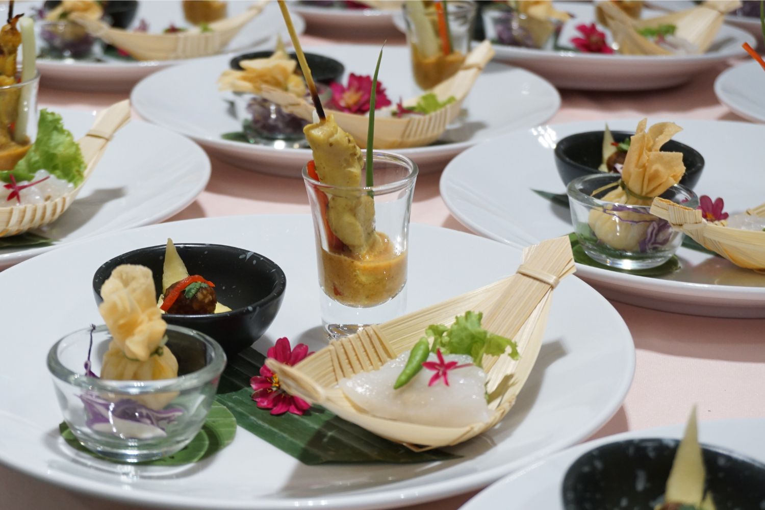 - Appetizer:เปิดต่อมรับรสด้วยอาหารว่างไทยประยุกต์ ได้แก่ ม้าฮ่อ, สะเต๊ะไก่, ปั้นขลิบนึ่งไส้ปลา และถุงทอง