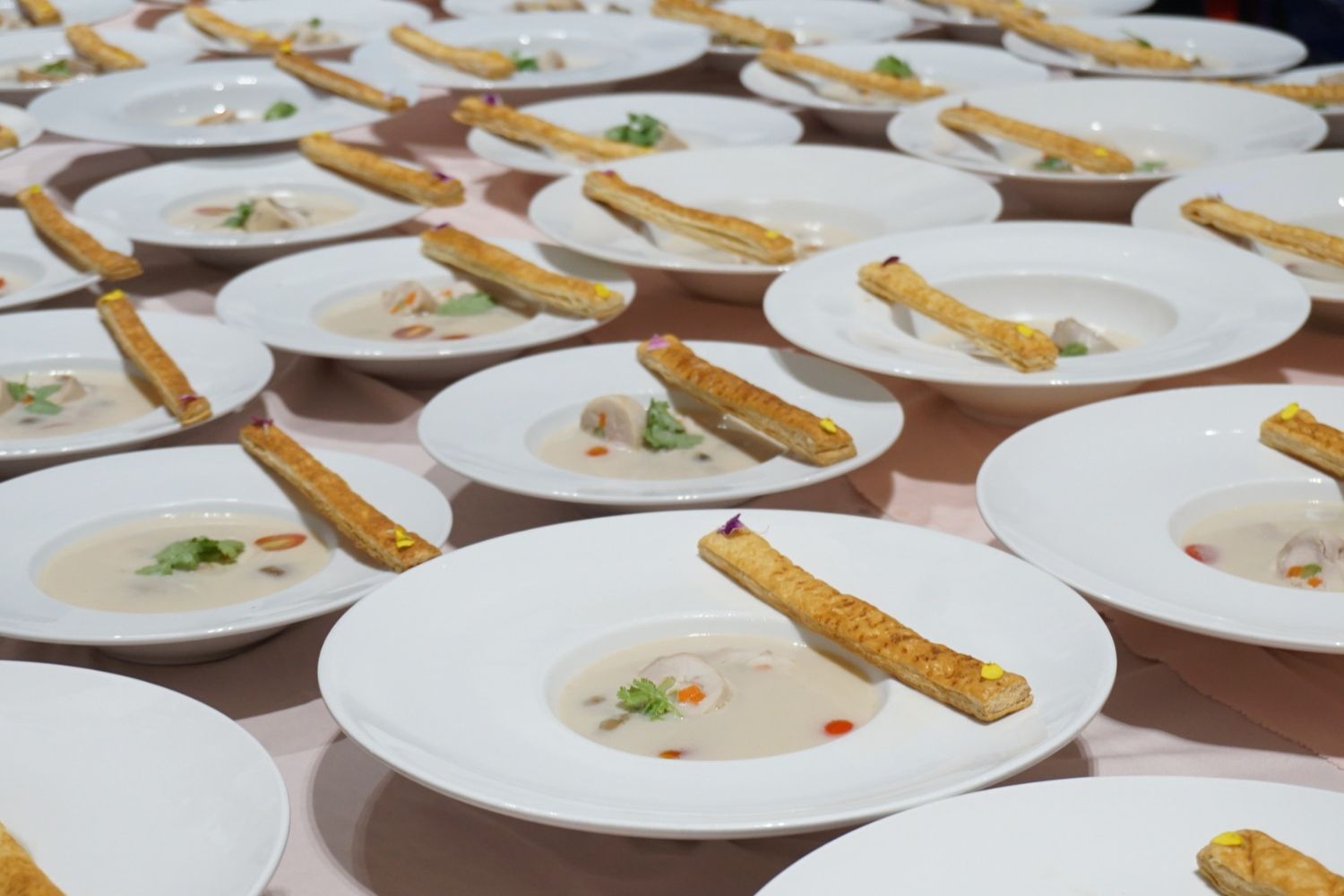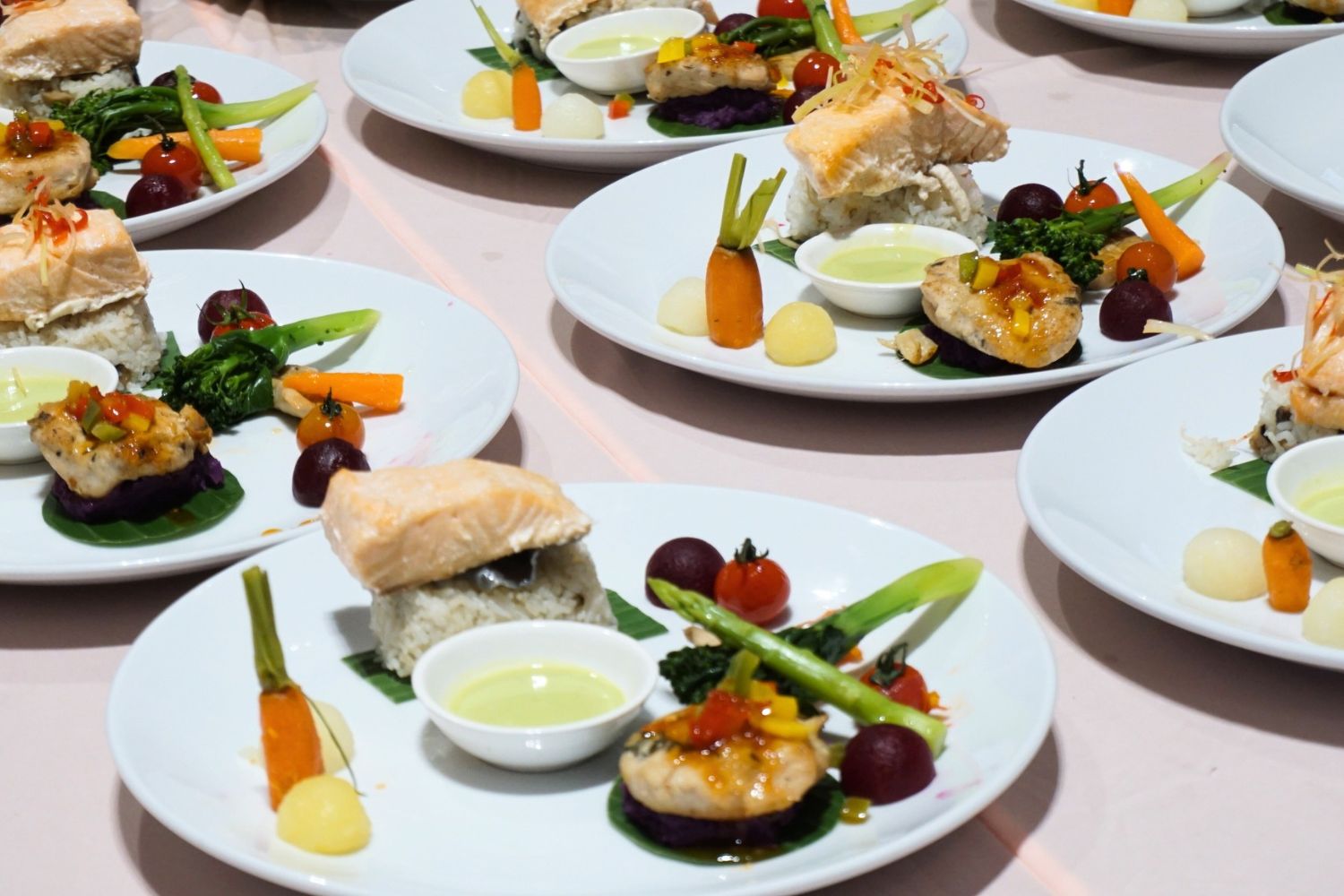 Set and Serve Catering ตอกย้ำความเป็นมืออาชีพด้วยการเนรมิตงานจัดเลี้ยงสเกลใหญ่ ณ พารากอน ฮอลล์ ชั้น 5 เพื่อรองรับแขกผู้มีเกียรติกว่า 1,000 ท่าน รูปแบบงานถูกออกแบบมาเพื่อมอบประสบการณ์ที่เหนือระดับผ่านการเสิร์ฟอาหารแบบรายบุคคล (Individual Set) โดยเราใส่ใจในทุกรายละเอียดความสวยงามและภาพลักษณ์ที่ดูหรูหรา ตั้งแต่การจัดเตรียมแก้ว Goblet และอุปกรณ์ภาชนะครบทั้ง 1,000 ชุด ไปจนถึงการจัดวางการ์ดเมนูอาหารบนโต๊ะทุกที่นั่ง